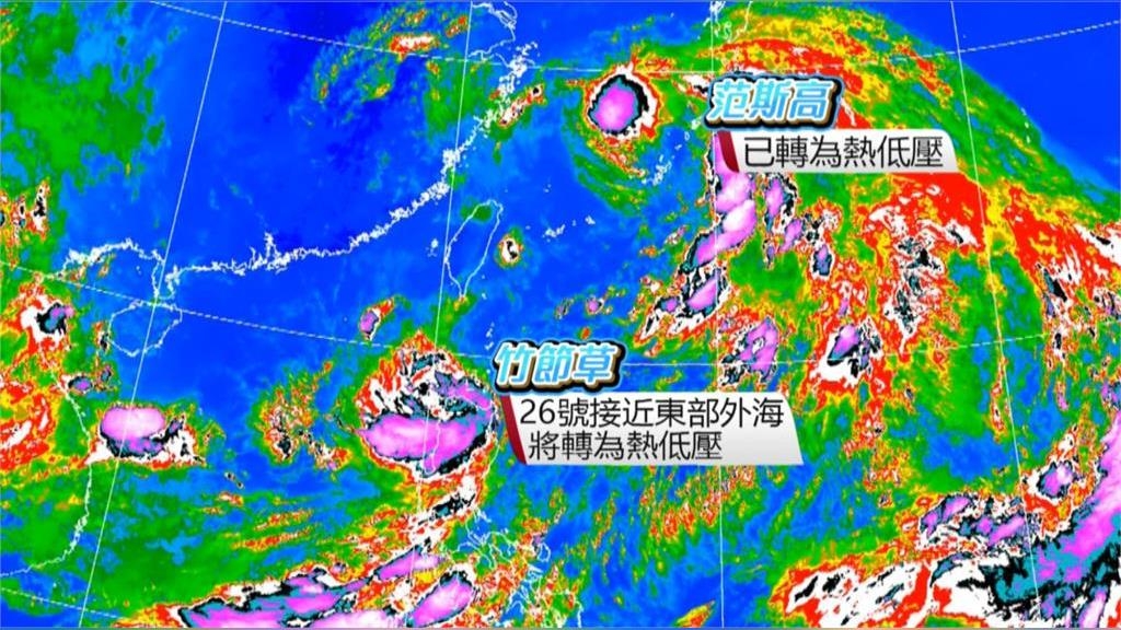 降雨忽大忽小,一波又一波,西北太平洋上原本三颱共舞,目前最接近台灣的范斯高,週五上午八點減弱為熱低壓,呂宋島附近的竹節草颱風,26號將接近東部外海,不過因為環境不利發展,也將減弱為熱低壓,至於最新生成的柯羅莎,對台灣沒有直接影響。