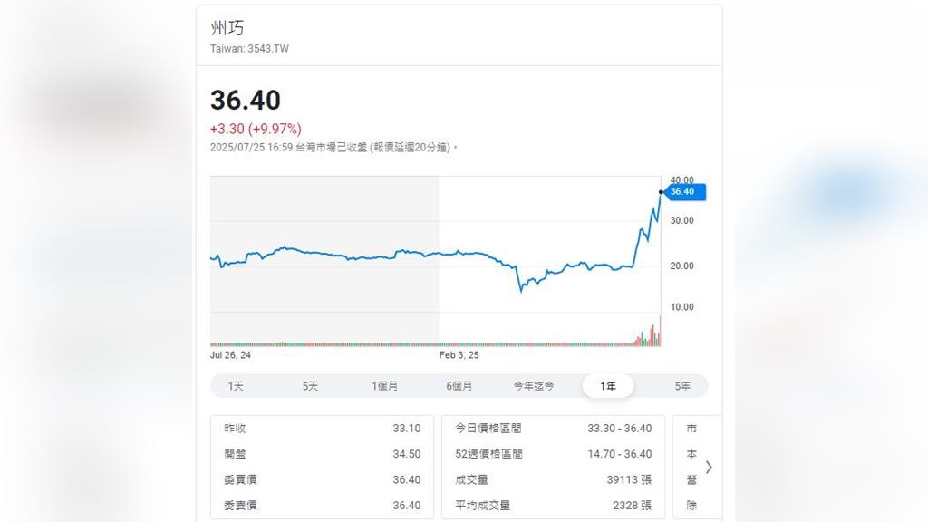 州巧最新月營收創近一年新低,基本面尚未明顯轉強。不過股價從4月關稅影響以來,已經從14.7元來到今天的36.4元,股價上漲2.5倍,最近買氣旺氣勢如虹,也讓市場關注。
