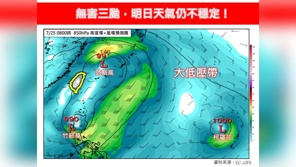 今年第7號颱風「范斯高」與第8號颱風「竹節草」在23日先後生成,形成「雙颱共舞」的罕見天氣型態,如今更有第9號颱風「柯羅莎」加入,海面上瞬間出現「三颱共舞」的現象。氣象專家林得恩今(25)日指出,雖然三颱對台灣無直接影響,但環境仍受大低壓帶影響,週六(26日)天氣仍不穩定!