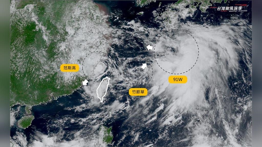 本週太平洋前後生成3個颱風,今天(26日)凌晨2點還是輕度颱風的竹節草,上午已經減弱到完全消失,范斯高目前在馬祖東北方,殘留雲系也重新組成熱帶擾動91W,這三個系統未來會逐漸整合成一個超大的低壓帶,台灣就位於低壓帶中。對此,氣象粉專「台灣颱風論壇|天氣特急」在臉書更新最新資訊指出,這樣天氣型態將維持好幾天,至少下7天的雨,尤其中、南部地區下雨時間長、伴隨大雨,提醒「大家要有下到生菇的心理準備」。