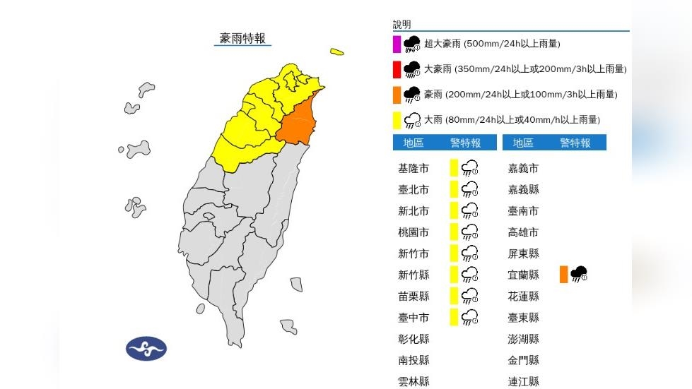 另外,氣象署也對宜蘭縣發布豪雨特報,表示有局部大雨或豪雨發生。