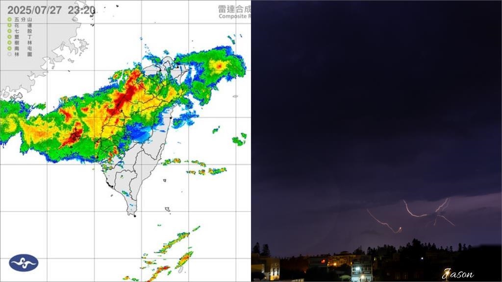 昨(27)日受低壓帶和西南氣流影響,中部出現短時強降雨。中央氣象署昨(27)日23時發布「豪雨特報」,雷達回波圖中澎湖地區完全被雲雨帶覆蓋,昨天深夜雷雨交加,讓在地居民都擔心受怕、難以入睡。澎湖1位當地民眾直擊現場還拍攝影片發布在臉書上,曝光閃電照亮夜空、雷擊的畫面。