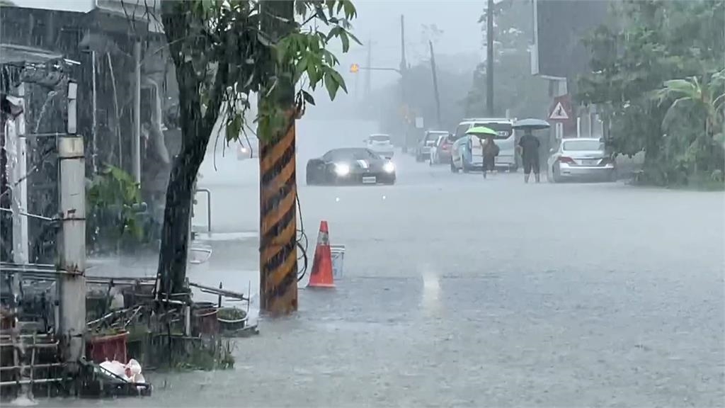 黑色法拉利開到一半突然停下來,不是車子出狀況或是沒油,而是被眼前這片汪洋嚇壞,思考幾分鐘,超跑駕駛決定回頭是岸,轉身離開,但並非人人都這麼幸運,立法院經委會到嘉義縣考察,雨刷跟不上爆雨速度,再看到路面時,已經來不及,水淹半顆輪胎,直接拋錨,只能下車、把車推回去!