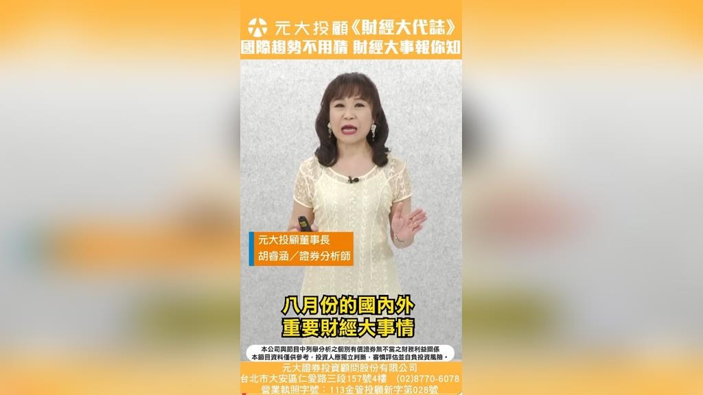 國際趨勢不用猜,財經大事報你知,趕緊帶您關心一下,八月份的國內外重要財經大事情,來看元大投顧董事長胡睿涵最新預測跟專業解析。