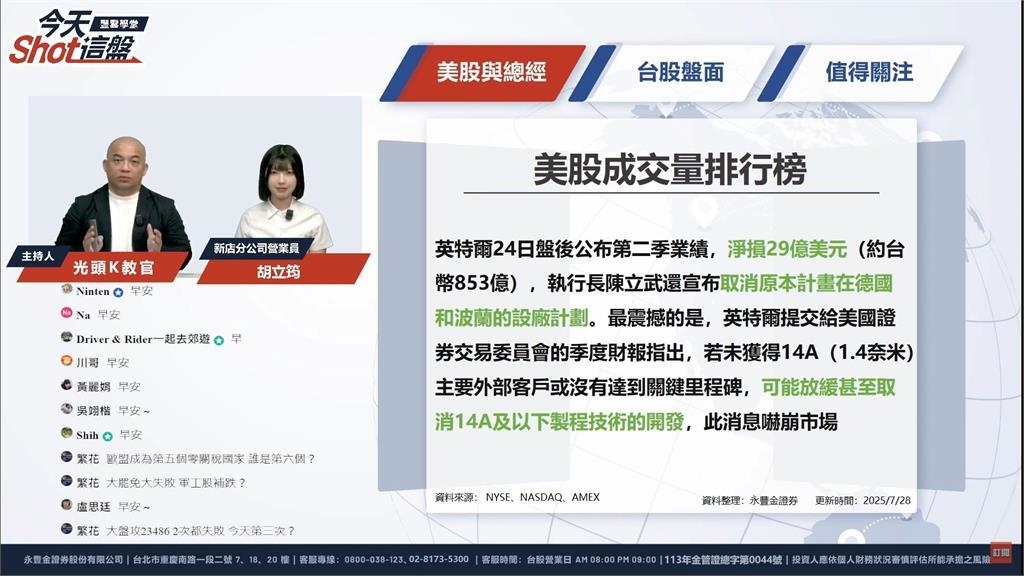 財經中心/綜合報導今天(28)台股開盤以23477開出,一度上漲0.65%,指數一度站上23564,尤其川普政府與歐盟達成關稅新協議,將多數歐洲商品稅率降至15%,為全球貿易信心打下強心針,至於科技界也傳出震撼消息,英特爾宣布取消歐洲建廠、台股盤面輪動加快,資金風向正是否悄悄轉變,永豐投顧帶您了解。