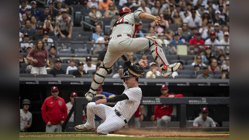 MLB(影)/從二樓拉到地面!費城人捕手「比扯鈴還扯的觸殺」封阻得分洋基超傻眼