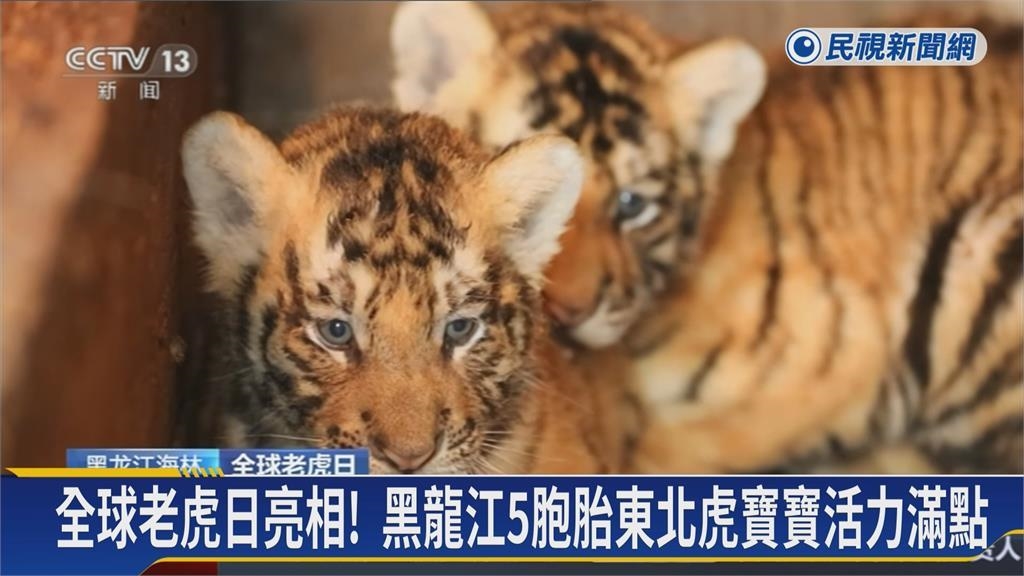毛絨絨的小老虎張嘴低吼,可愛到不行,牠們是中國黑龍江,上個月新接生的五胞胎,虎生第一個「全球老虎日」罕見亮相。