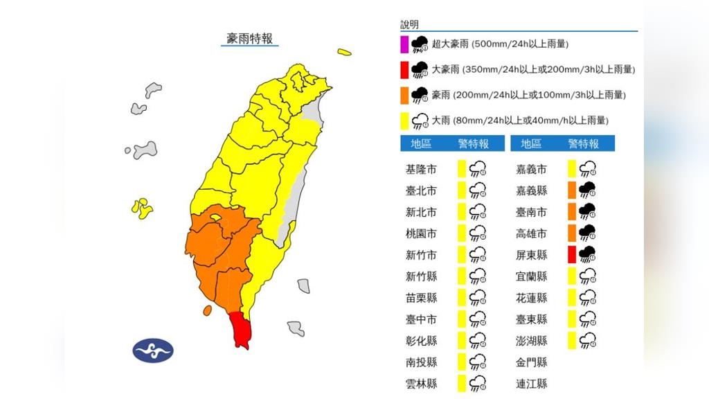 同時,氣象署指出,今日恆春半島地區有局部豪雨或大豪雨發生的可能性,屏東縣列為大豪雨區,需特別留意強降水引發的山洪暴發、土石流等災害。嘉義縣、台南市、高雄市及屏東縣其餘地區亦被列為豪雨警戒區,將有局部大雨或豪雨發生的機率。