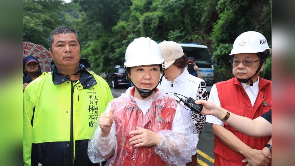 受西南氣流影響,中部地區昨(30)日晚間至今(31)日持續降雨,台中市太平區黃竹里竹村路2巷口上午因雨勢造成發生邊坡崩塌、道路中斷,影響約300戶居民進出。台中市長盧秀燕取消今早原定的市政行程,緊急率領團隊到場勘災,並責成相關單位全力搶通,保障居民安全。針對是否覺得警報太晚發布?她則說,這波天氣變化太過劇烈,不太容易預測,也不能怪氣象署。