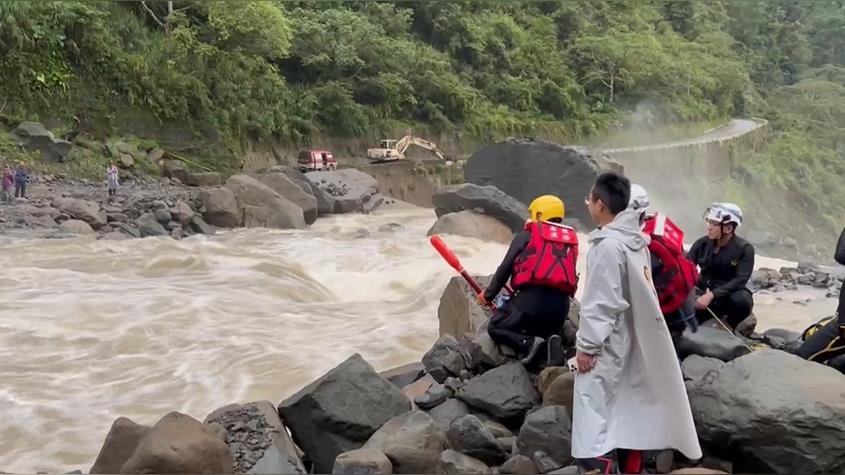 這滾滾濁流,用噴的,就像河流當中,突然吐出了一個黃色的瀑布,又急又大的水流,不停的往下沖,人不可能過得去!你沒看錯,坐在石頭上,有一個人背向鏡頭,他就望著眼前那顆,堵住去路的大石頭!他們是受困在山區的採茶師,31日傍晚消防隊員設法靠近受困人員,發射拋繩槍到對岸再架繩將物資等運到對岸,至少能喝水,等雨勢趨緩,水流變小後再想辦法將人救出來。