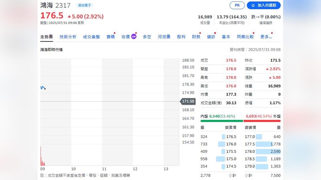 根據市場統計,鴻海停牌前一天的市值為2兆3,824億元,股本1389億元。東元的股本為213.8億元,市值為990.24億元。今天一開盤,鴻海股價來到 178元上漲6.5元、東元則是盤前漲停,來到51 元,市場預估這宗交易被東元股價較有利。