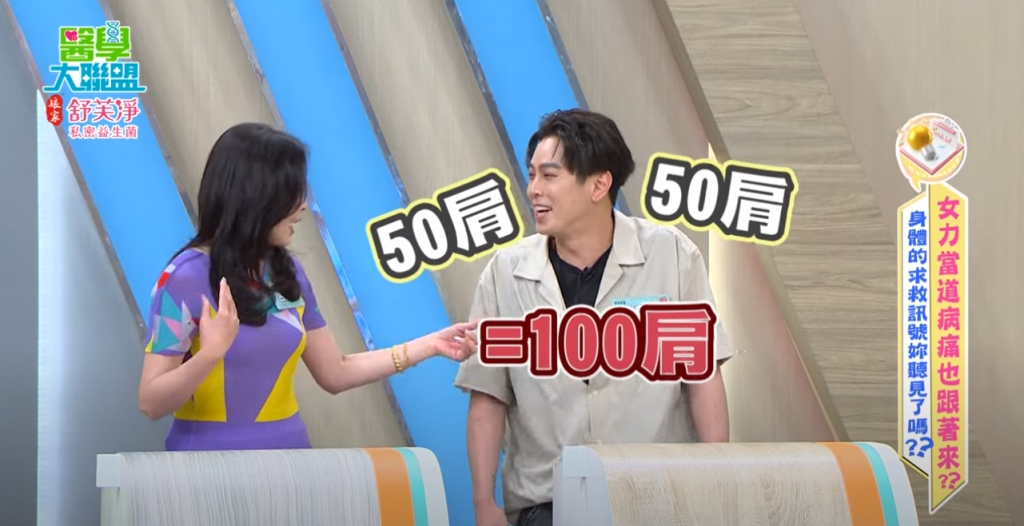 資深媒體人呂文婉近日在節目《醫學大聯盟》中指出,「說到3C,我就是被迫害的人」!並直言別人一邊肩膀有50肩,自己的兩邊肩膀都出現問題,號稱100肩!讓現場震驚「低頭划手機」竟然造成肩頸惡化年輕化。