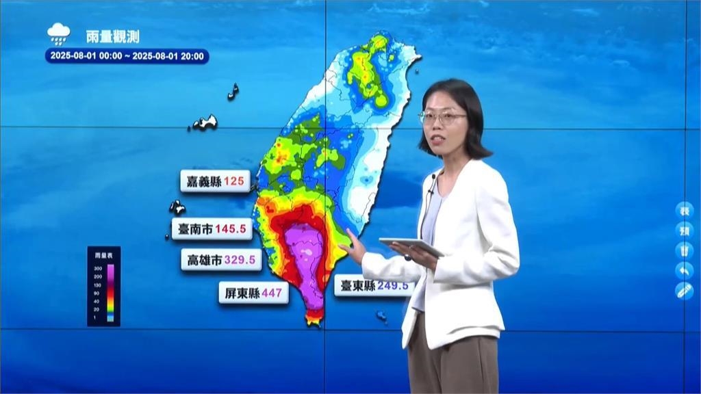 朱美霖表示,今日台中以南有斷斷續續的降雨,根據氣象署資料,今日0時至晚間8時,在南部山區的累積雨量十分可觀,高雄山區達到329.5毫米,屏東山區有447毫米,台東山區也有249.5毫米;而北台灣則是局部發生午後雷陣雨。