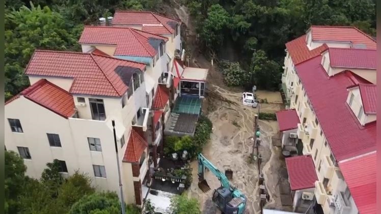 台中大坑的天星社區,被土石流慘淹一片,空拍畫面曝光,社區後方的山坡出現大面積崩塌,土石泥流狂洩而下,超厚的泥流往下沖,淹沒白色轎車,轎車卡在泥濘當中,兩旁的住戶更是首當其衝,承受泥流衝擊,趁著雨勢放緩,居民著手清理家園。看著滿地的泥濘,居民說,住在這裡將近30年,第一次遇到如此慘況,慶幸的是,只有家門口被慘淹