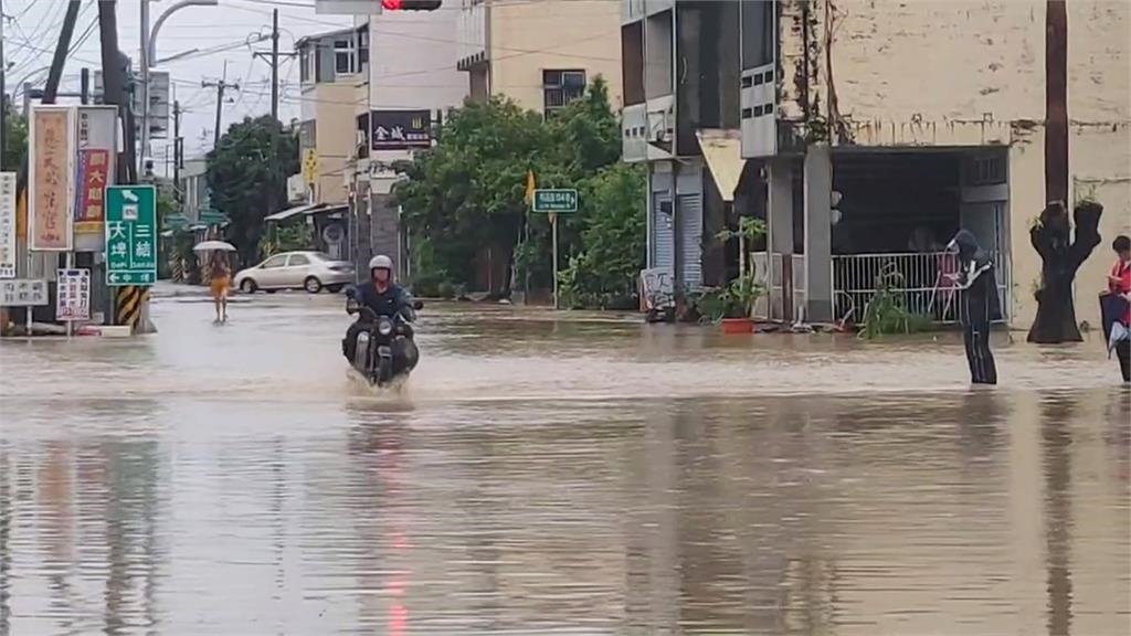 不過淹水的,還有這裡,整條柏油路,變成一條小河,水深接近小腿肚,只見機車騎士,不畏大水,直直向前行駛。斗南鎮,有16個里,全都泡在水裡,影響300多戶住家,居民只能緊急堆沙包自救,不過淹水問題,其實常常發生。