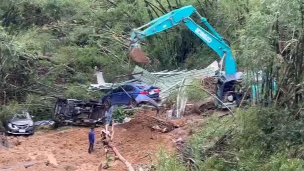 怪手不斷喬角度,好不容易,整輛汽車,才被吊了起來,柳營山區一處民宅,地基全被掏空,一半懸空在泥砂邊界,邊坡土石大面積滑落,似乎沒停過。