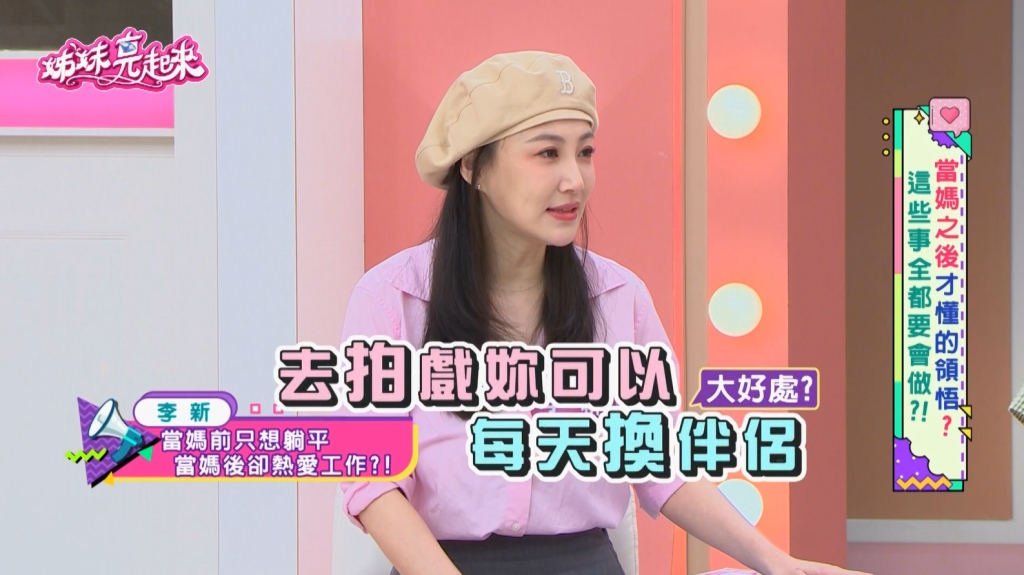 李新強調,而且拍戲可以「每天換伴侶」、「還有紅杏出牆的機會」!讓她不斷直言,「這麼好的工作哪裡找」!比起帶孩子整天悶悶不樂,只當媽媽一個身分,李新果斷對著鏡頭說,「工作多好啊!一日三餐加宵夜!我要工作,我一輩子都要工作」!讓錄影現場工作人員笑彎了腰。