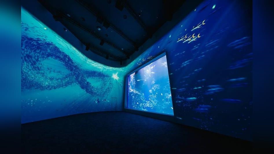 此外,1樓「黑潮之海」及「海洋學園」展區,館內設置劇院等級的沉浸式投影與大型大洋缸,展示鯊魚、魟魚等太平洋海洋生物。館內也設有互動體驗區,包括以高美濕地為概念的涉水區,讓民眾可一邊涉水觀察生物、一邊欣賞台中港與濕地美景。