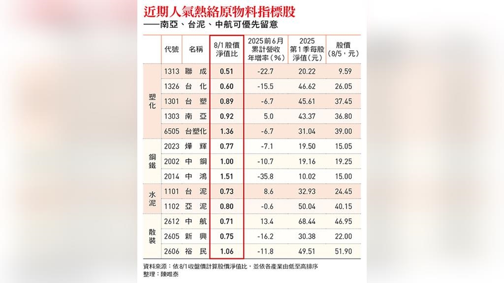 附表是近期較具人氣的原物料相關指標股,建議投資人挑選股價淨值比低,且上半年累計營收較去年成長者,如表中的南亞(1303)、台泥與中航值得留意。