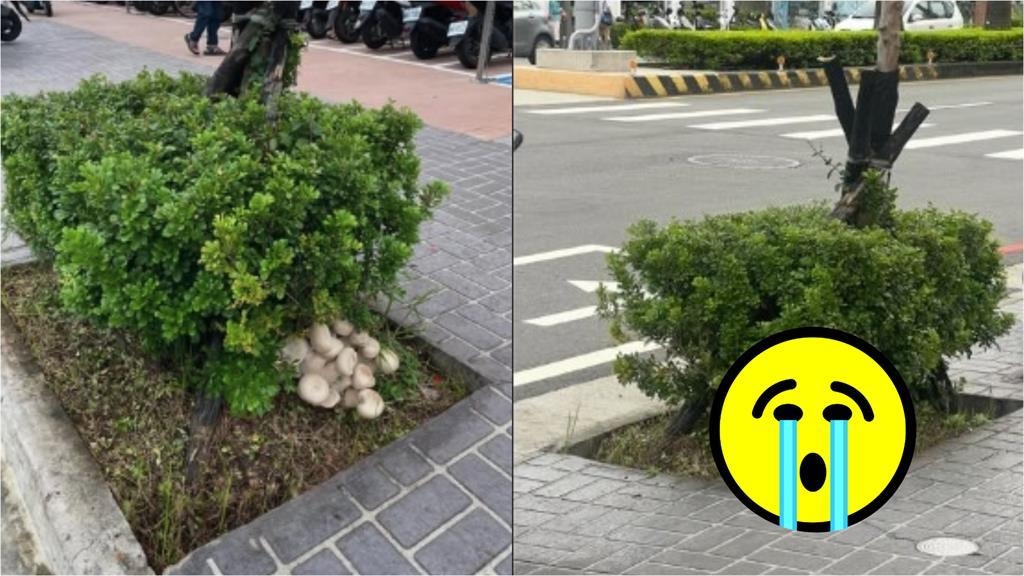 從原PO上傳的畫面可見,台中北區忠明路街頭綠化帶中,悄悄冒出一群「白色巨菇」,如同一叢叢小傘般聚集在灌木叢下方。這群香菇看上去形狀飽滿、色澤潔白,但生長的位置奇特,緊貼著路邊行人道旁的磚縫邊緣,一旁就是機車停車格與商家林立的熱鬧街景。