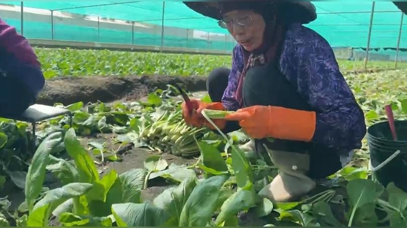 農民蹲坐菜園,採收青菜,雨災過後,量少的可憐,雨災過後,走一趟產地菜園,農民說,大雨釀災,菜園被大水淹沒,連帶影響收成。這一區種的是芥藍芽,但放眼望去,一片枯黃,全都趴在地上,種菜種到損失,農民說,收成有四五成就要偷笑,快要血本無歸。