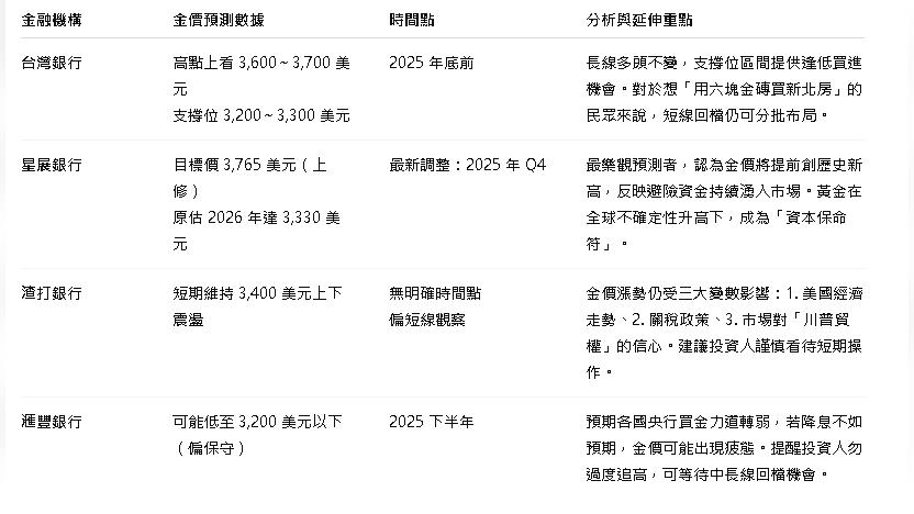 目前包括瑞銀、花旗、星展等多家外銀仍看好金價長線走勢,尤其在全球貨幣政策轉向寬鬆、美元回落等趨勢下,黃金有望持續成為資金避風港,台灣銀行預測金價長線來看仍是多頭,目前國際各主要機構預測,金價年底前高點上看3600到3700美元,支撐價位則落在3200到3300美元之間。