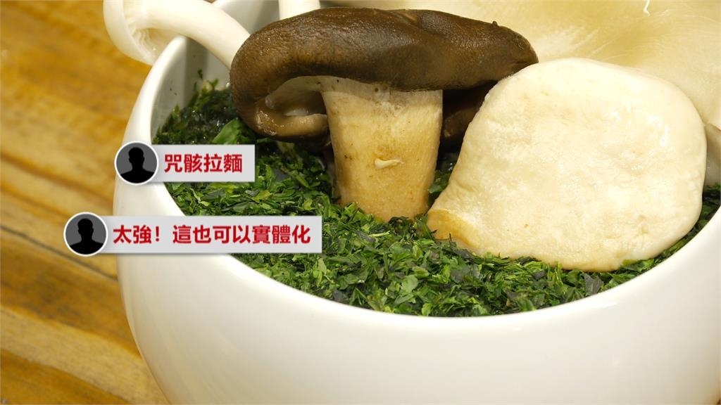 拉麵上撒滿一層厚厚的青海苔粉,再擺上的手掌大的鮑魚菇等多款香菇,端上桌色香味俱全,但是等一下,這畫面怎麼似曾相識?先前高雄連日豪雨,安全島上"生菇"的經典畫面,台北中山區這家拉麵店,完美復刻場景。網友讚嘆,"太強,這也可以實體化",甚至笑稱根本是"咒駭拉麵"。