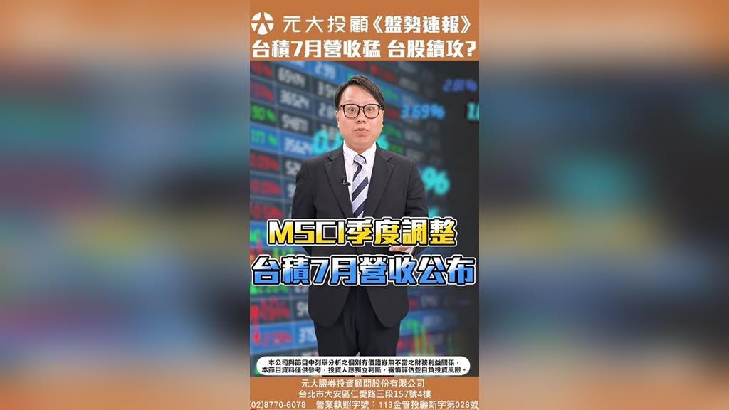 台積電7月營收公布,MSCI季調調整,盤勢速報由元大投顧專業資深經理蕭森寶證券分析師為您分析。