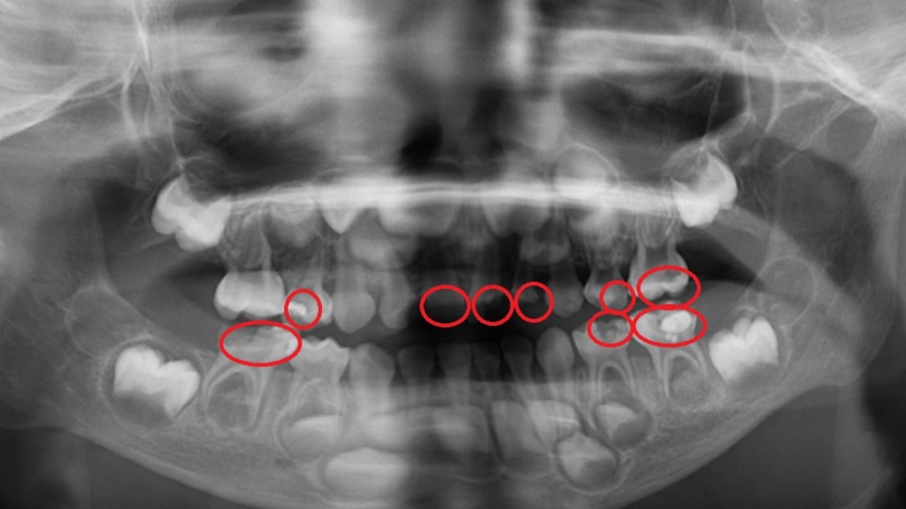 5歲小宏在幼兒園定期接受塗氟和口腔檢查,均未察覺異狀,但日前直到卻出現牙痛情形,而且臉頰腫脹相當不舒服,因此被父母帶至就醫。台北慈濟醫院兒童牙科醫師陳默檢查發現,小宏罹患嚴重齲齒並已引發蜂窩性組織炎,雖然積極治療,但最後不得不拔除4顆已無法補救的乳牙。醫師陳默對此表示,學校塗氟雖有幫助,但無法取代完整的牙科檢查與X光診斷,家長應該自孩子長牙後就要定期帶至牙科門診檢查,勿等蛀牙惡化才就醫。