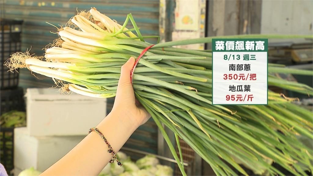 菜販黃小姐:「算這幾年近五年來的比較嚴重的一次,不要有颱風來的話,復耕的話很快,只是慘重的是南部的絲瓜,絲瓜會貴上來了。」批發價貴,就連菜販也捨不得買來賣,週四北農休市,週三批發價一樣的貴的超驚人,南部蔥尾端有些許枯萎,這樣一把飆破300元,漲到350元,貴三倍,地瓜葉菜價稍微回落,批發價一斤95元,菜藍族狂抱怨。