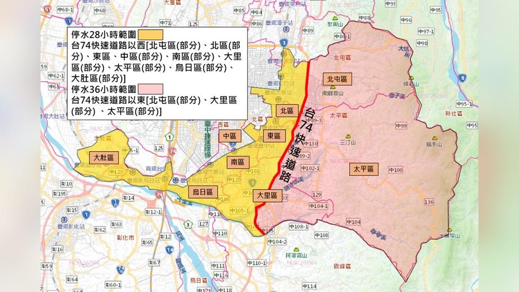 台中市經發局說明,本次停水區域包含北屯區、北區、東區、中區、南區、大里、太平、大肚、烏日等9個行政區,台74號快速道路以西,約19萬戶將於20日(週三)14時逐步恢復供水,停水約28小時;快速道路以東約11萬戶,因高地及管線末端,須於22時逐步恢復供水,停水約36小時。