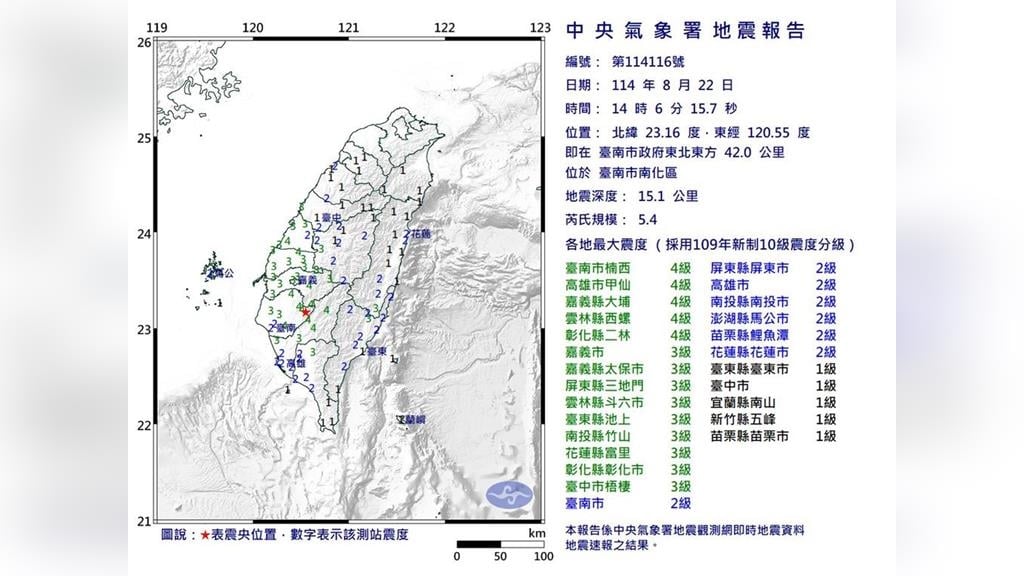 今(22)日下午14時06分,台南市南化區發生規模5.4的有感地震,最大震度台南楠西、高雄市甲仙、嘉義縣大埔、雲林縣西螺、彰化縣二林4級。