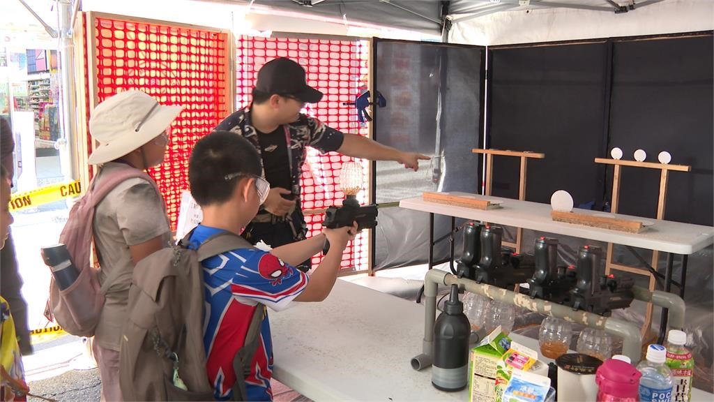 戴著護目鏡,拿起水彈手槍,瞄準目標、發射打靶,場邊還有教官一對一教學,不論大朋友、小朋友都玩得不亦樂乎。民眾:「我覺得蠻好玩的,很像體驗那種,日本夜市可以打靶玩偶的那種感覺。」民眾:「有打過漆彈而已,單純打漆彈,沒有像這種 這樣子打(靶),沒打過靶。」民眾:「體驗起來不錯、很好,我之前有玩過實彈的,但實彈的那種,一開始開會不習慣,手會抖,然後這種的比較不容易抖。」