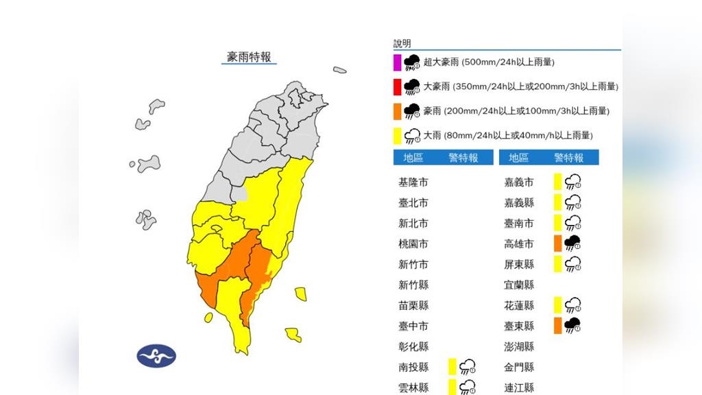 氣象署下午4時5分針對高雄市、台東縣發布豪雨特報,而大雨特報範圍則涵蓋南投縣、雲林縣、嘉義市、嘉義縣、台南市、屏東縣、花蓮縣、台東縣。