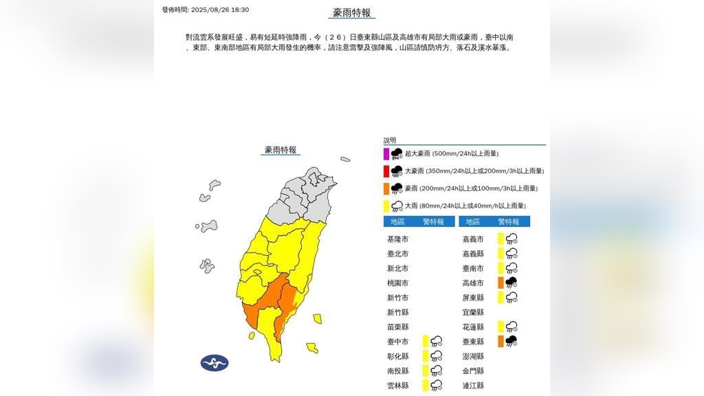 由於對流雲系發展旺盛,易有短延時強降雨,中央氣象署於今(26)晚18時30分針對9縣市發布豪、大雨特報,請民眾注意雷擊及強陣風,山區請慎防坍方、落石及溪水暴漲。