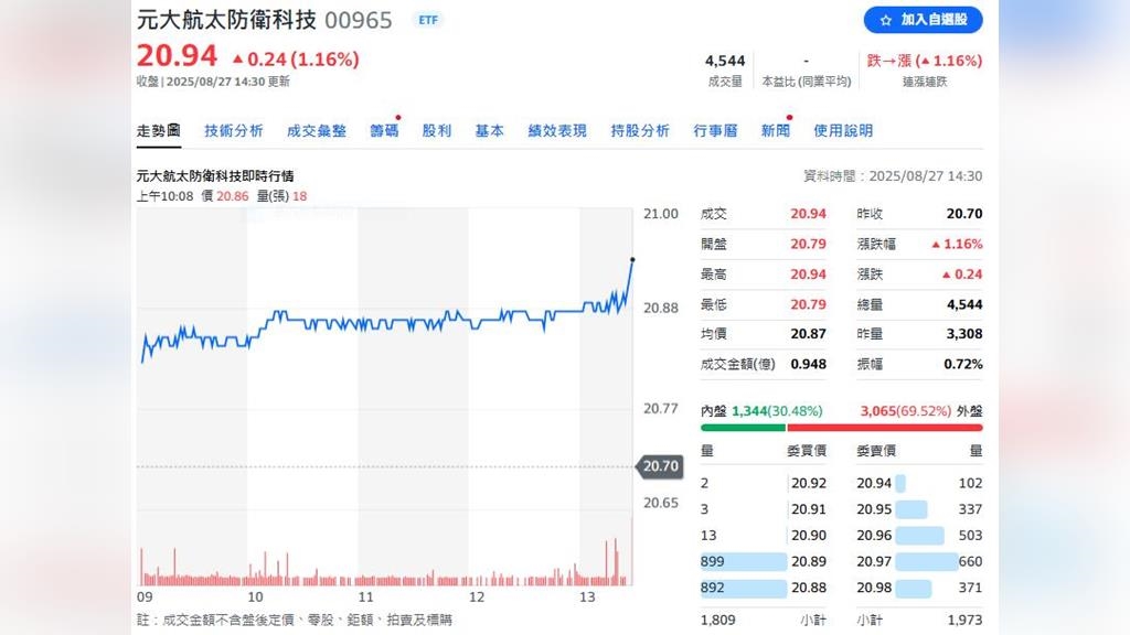 全球軍工股大爆發,除各國軍費投入相繼新高,美國政府考慮入股美國國防企業,以及南韓有望獲加拿大潛艦訂單,再挹注穩定長線訂單利多。國內唯一聚焦國防軍工的元大航太防衛科技(00965),27日再創收盤新高20.94元,今年以來股價上漲43.92%。