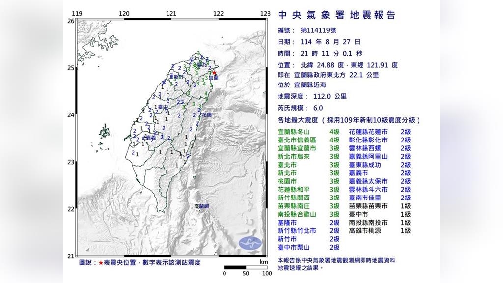 氣象署指出,今日21時11分宜蘭近海發生規模6.0的有感地震,震央位於宜蘭縣政府東北方22.1公里,地震深度112.0公里。各地最大震度,台北市信義區、宜蘭縣冬山4級;宜蘭縣宜蘭市、新北市烏來、台北市、新北市、桃園市、花蓮縣和平、新竹縣關西、苗栗縣南庄、南投縣合歡山3級;基隆市、新竹縣竹北市、新竹市、台中市梨山、花蓮縣花蓮市、彰化縣彰化市、雲林縣西螺、嘉義縣阿里山、台東縣成功、嘉義市、嘉義縣太保市、雲林縣斗六市、台南市佳里2級;苗栗縣苗栗市、台中市、南投縣南投市、高雄市桃源1級。