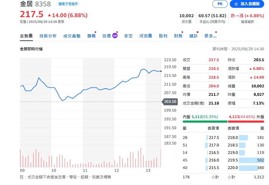 被網友戲稱為''妖股''的上游銅箔廠金居(8358)受惠於AI伺服器帶動PCB往高速高頻銅箔材料升級,銅箔市場太熱,也讓金居這兩個月股價驚驚漲,29日又飆漲14元,以217.5元作收,漲幅6.88%,成交量衝破10萬張,不過被關禁閉的金居,股價還能有這樣的表現,也讓不少網友驚呆說,「出關後再上250」。