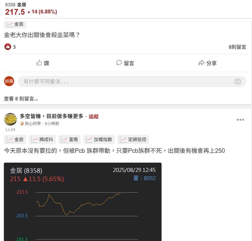 「股市爆料同學會」有網友說,「好險我前天賣了昨天又買回來」,還有網友分享感謝文說,「感謝主力,讓我每天都睏飽數錢,還能發個文酸酸那些,急著對號入座的傻空,繼續向上噴,加油」、「今天原本沒有要拉的,但被PCB族群帶動,只要PCB族群不死,出關後有機會再上250」,還有網友敲碗問說,「金老大你出關後會殺韭菜嗎?」