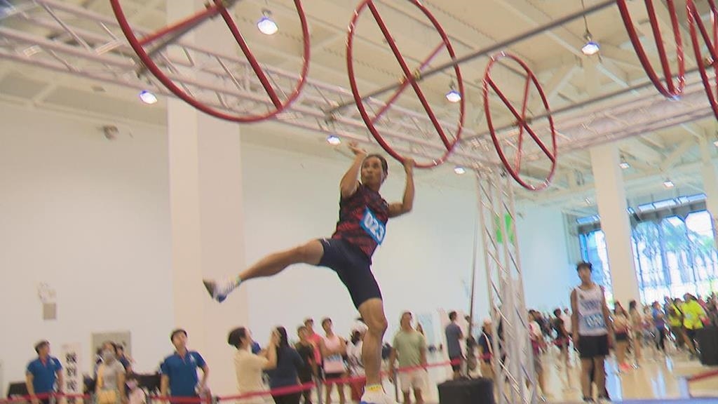 比賽開始,選手們縱身一躍,拉住轉輪,穿越障礙,接著用肌力懸掛空中舞環,不只比速度比耐力,更要有爆發力,才能與對手拉開距離。國內首次以國際賽規格打造的體能障礙賽,在高雄展覽館登場,比賽共有兩項,第一項是較休閒的勇闖挑戰組,參賽者必須在限定時間內,面對跳躍、攀爬、翻越、平衡等多重關卡。而第二項,則是主打巔峰對決組,速度與爆發力的對決,包含平衡木、單槓跟攀爬近乎垂直的大牆,誰能在最短時間衝破終點,就能拿下勝利。參賽選手李予恩:「這次我覺得助跑距離變短了,我踩上去的步伐跨太大了,所以沒辦法有效的上去。」參賽選手施柏丞:「訣竅一些擺動,跟要把握力練起來,握力很重要,然後知道怎麼擺很重要。」