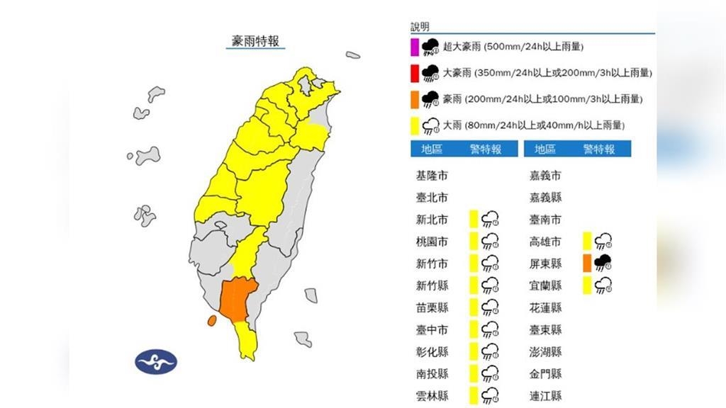 氣象署針對新北市、桃園市、新竹市、新竹縣、苗栗縣、台中市、彰化縣、南投縣、雲林縣、高雄市、宜蘭縣、屏東恆春半島發布大雨特報,表示這些地區有局部大雨發生的機率。