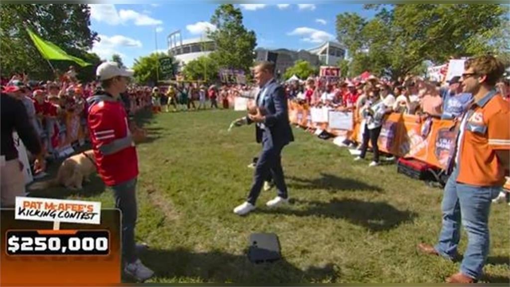 他在直播中說,Peter在比賽場上拉了,Logan聞一聞吧!這是Peter排出的肥料,這能孕育出偉大的東西,看看Peter的便便能不能幫你長出25萬美元?沒想到真的帶給Logan狗屎運,Herbstreit單膝跪地幫他扶著球,結果來自俄亥俄州的Logan,大腳一踢成功射進,賺進25萬美元的獎金。