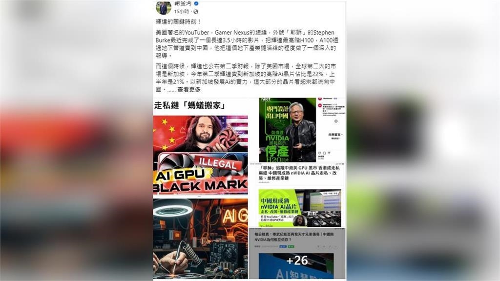 謝金河說:美國著名的YouTuber,Gamer Nexus的總編,外號「耶穌」的Stephen Burke最近完成了一個長達3.5小時的影片,把輝達最高階H100,A100透過地下管道賣到中國,他把這個地下產業鏈活絡的程度做了一個深入的報導。