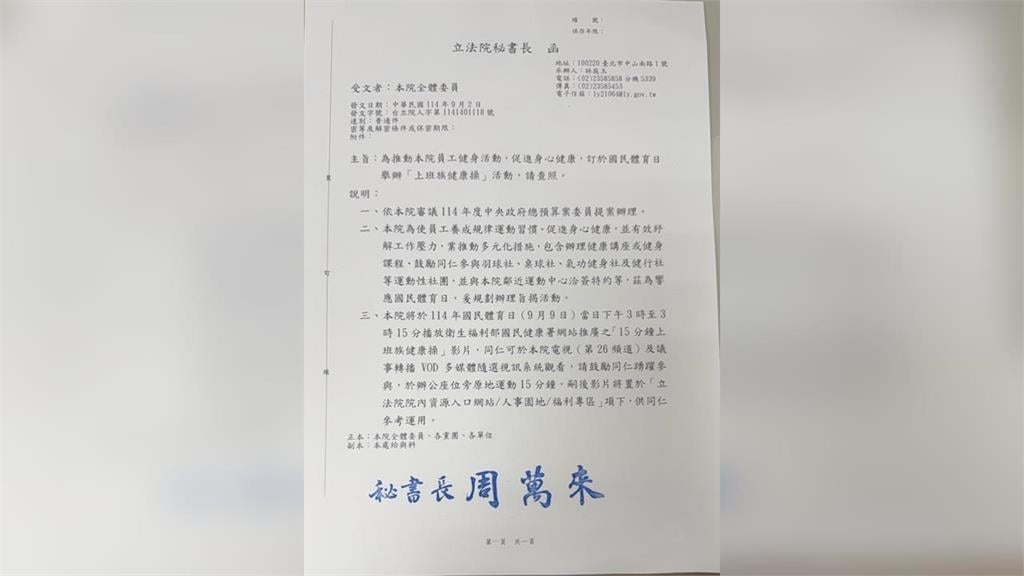 政治中心/陳妍伶 台北報導9月9日是國民體育日,立法院秘書長周萬來今(9/2)日發文給全體立委、各黨團及院內各單位,宣布當日下午3時至3時15分,將播放衛福部國民健康署製作的「15分鐘上班族健康操」影片,鼓勵所有立法院同仁在辦公座位旁原地運動。