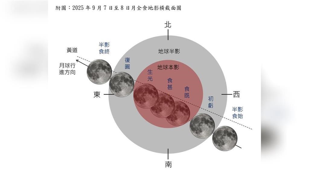 首先,氣象署提到,本次月全食的全部過程,自台灣時間9月7日23時27分起,由「半影食始」揭開序幕、8日0時27分「初虧」、1時30分「食既」、2時12分「食甚」、2時53分「生光」、3時57分「復圓」,最後在4時57分「半影食終」結束,共歷時5小時又30分鐘,其間於1時30分至2時53分是最精華的全食階段,計1小時23分鐘。