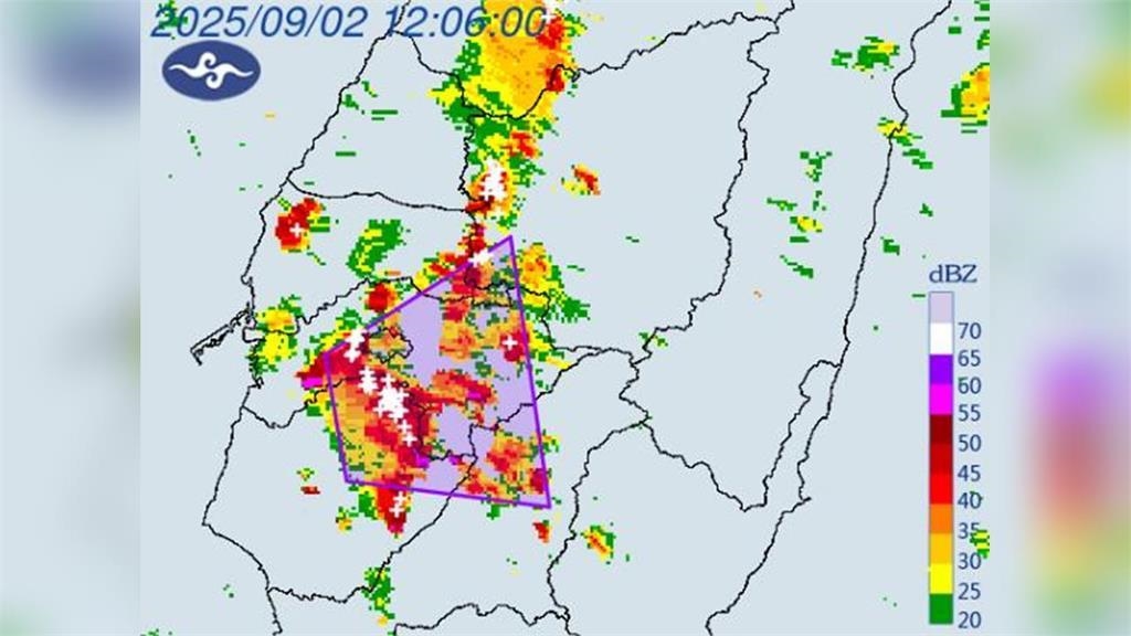 中央氣象署今(2)日中午12時18分針對嘉義縣、高雄市、雲林縣、嘉義市、南投縣、台南市發布「大雷雨即時訊息」,持續時間至下午1時15分。對此,氣象署請民眾慎防劇烈降雨、雷擊、9級以上強陣風,溪(河)水暴漲,坍方、落石、土石流,低窪地區慎防淹水,以及低能見度。