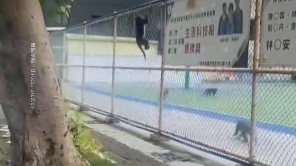 聲源:小朋友:「哇四隻猴子。」一隻獼猴沿著校園鐵欄杆往上爬,只見校內籃球場上早已聚集三隻猴子悠哉漫步,一旁學生見狀驚聲尖叫。附近民眾:「有看過,牠有時候跟我兒子搶早餐。」附近民眾:「看到成群結隊的猴子,大概七隻八隻,覺得牠比較可愛啊,有的小孩子還會想去摸。」好幾隻獼猴大喇喇入侵校園,地點就在高雄鼓山區一間學校,就怕小朋友年紀小,好奇靠近觸摸,校方不僅加強宣導,也將室外的垃圾桶加蓋。聲源:當事學校校長張簡助立:「馬上跟學生講,趕快進到校園裡面,就不要去接觸牠,不要挑釁不要餵食,不要追趕也不要去圍觀。」