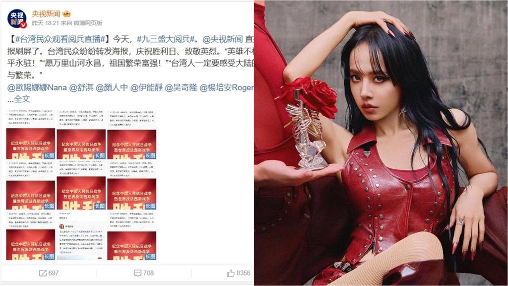 中國官媒昨(3)日零時發微博慶祝「九三閱兵」,中國娛樂圈明星緊跟轉發,晚間央視甚至列出已轉發的台灣藝人,還親自按讚認可。然而截至今(4)日多位藝人還沒轉發微博表態,其中蔡依林被小粉紅點名砲轟。不過也有不少中國網友理性看待,反而將矛頭轉向玻璃心碎滿地的小粉紅。