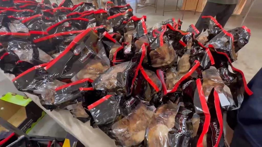 這一袋一袋又一袋,從箱子裡被提上來,放在桌子上,第一層,擺滿了,擺不下的,就再往上堆!這是什麼呢?看顏色與外型,是烤雞肉嗎?可是這種包裝,才看得到完整一隻雞,那再回頭來看這一袋一袋,裡面是!原來是從大賣場買來的,烤大雞腿,每袋8支,一天準備150袋,一天就有1200支,廟方說會連拜3天,累計高達2800支!出現在中元普渡的場合,雞腿特別挑出來,堆小山,是針對什麼,量身打造的呢?