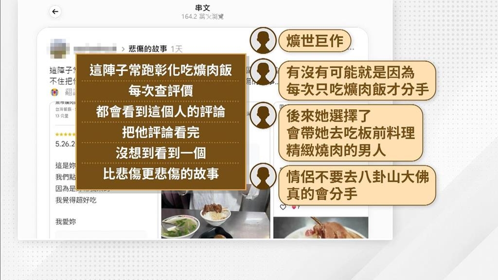 這段戀情從爌肉飯開始,也從爌肉飯結束,網友熱烈討論,有人說這真的是爌世鉅作!還有人說有沒有可能就是因為每次只吃爌肉飯才分手?也有人說,後來她選擇了會帶她去吃板前料理、精緻燒肉的男人。不過也有網友看到評論中有八卦山大佛,歪樓留言說情侶不要去,真的會分手。